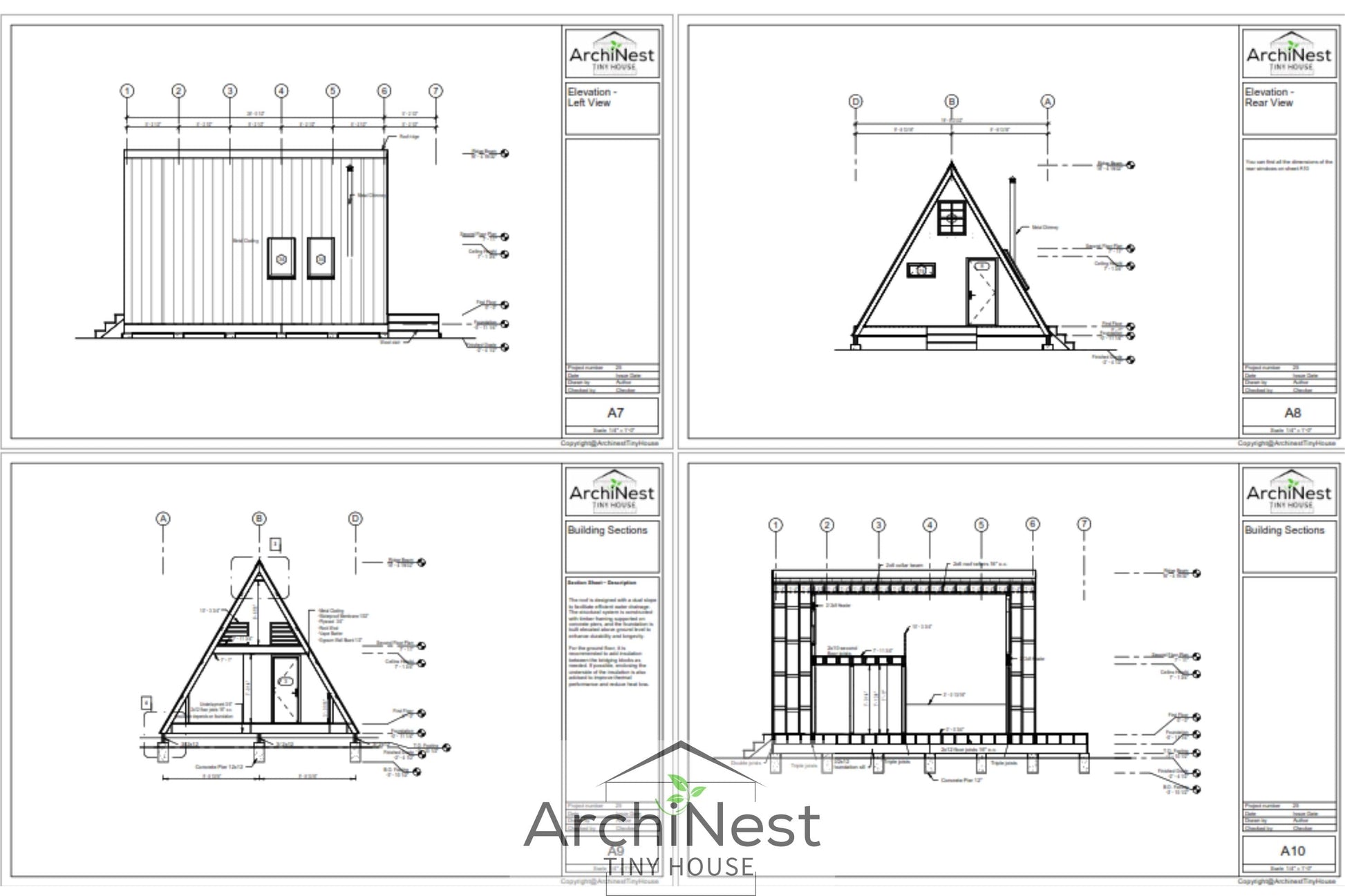 The package contains fully dimensioned floor plans, exterior elevations, building sections, roof and foundation plans, and detailed framing drawings.